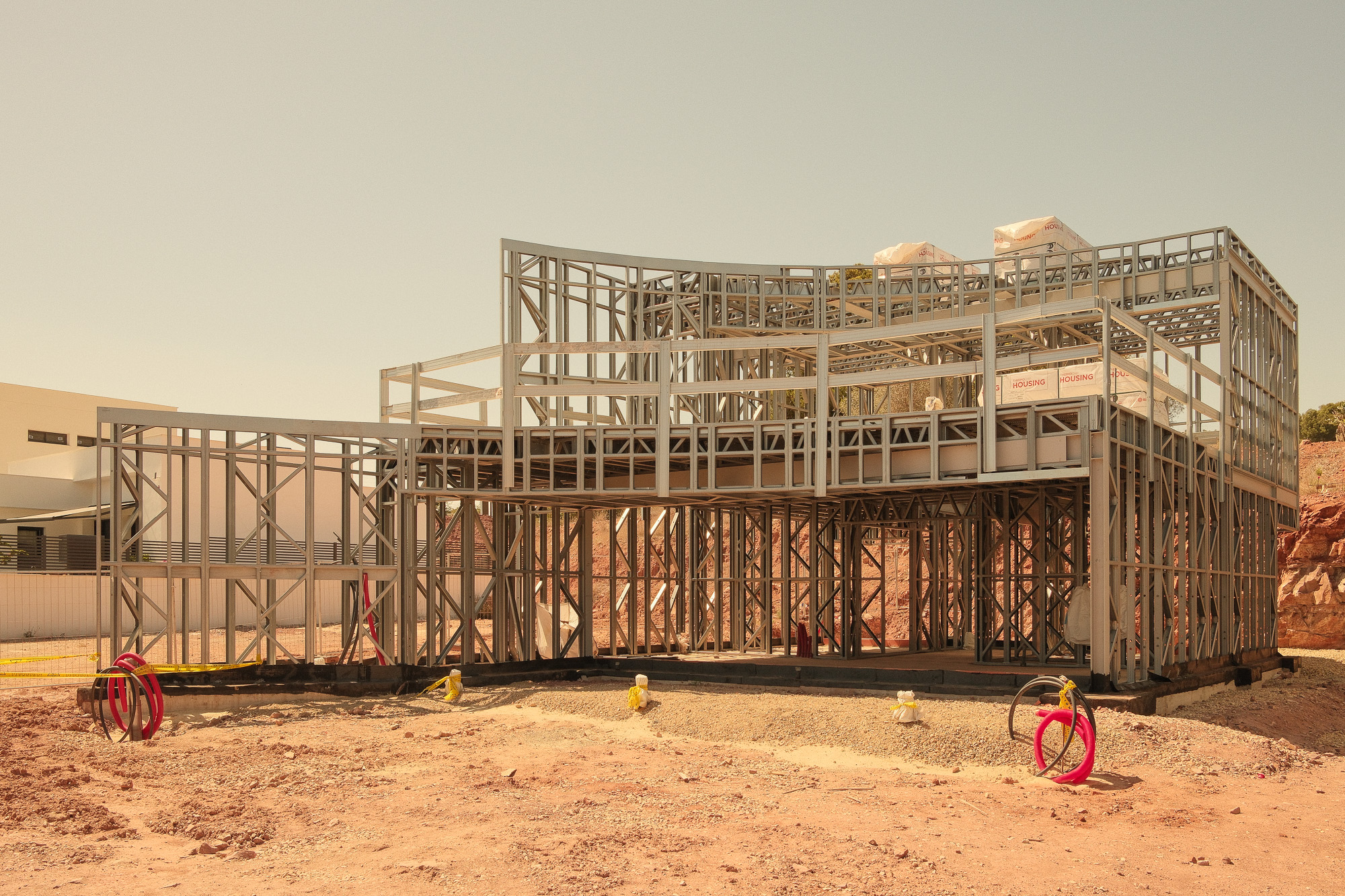 El sistema constructivo traslada esta precisión al proceso de obra. La estructura en steel frame de las tres viviendas se ejecuta en un plazo de dos semanas, asegurando una correspondencia directa entre proyecto y construcción.